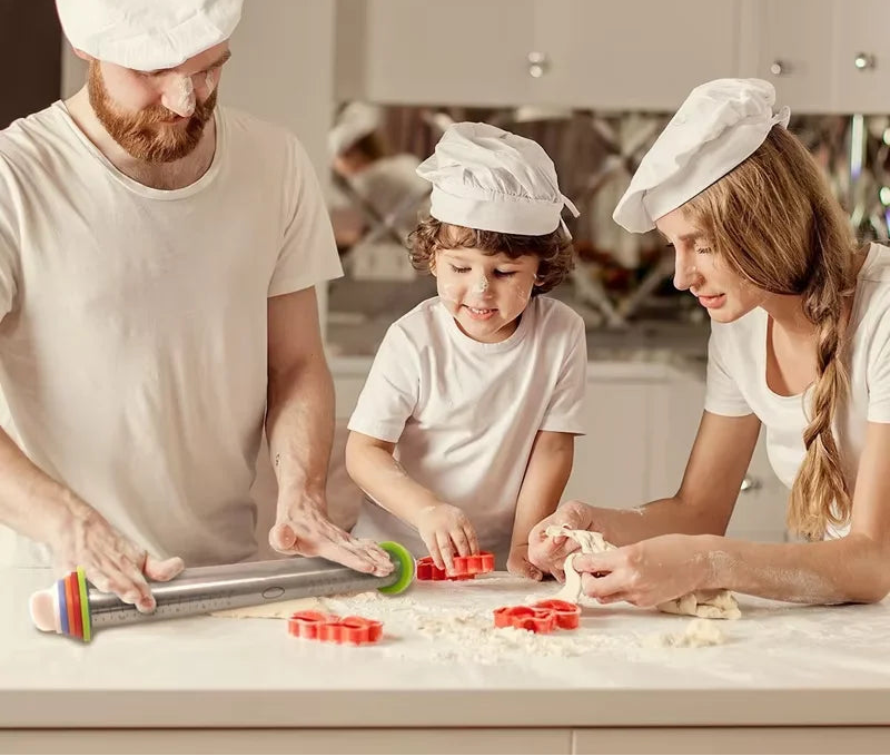Mit dem Stainless Steel Adjustable Rolling Pin mit Backmatte rollst du Teig präzise und mühelos aus. Dank der verstellbaren Dicke-Ringe kannst du die Teigstärke genau kontrollieren – ideal für Kekse, Pizza, Brot, Fondant oder Gebäck.